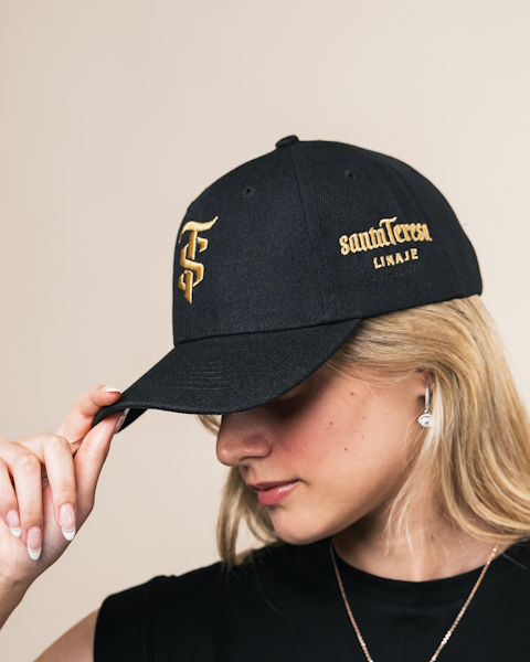 Gorra en color negro con bordado dorado inspirado en Santa Teresa Linaje, con cierre mágico para mayor ajuste.